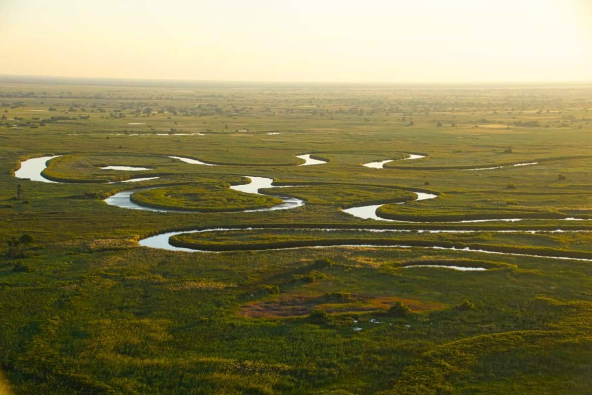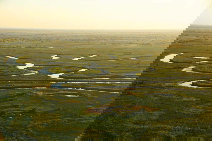 The unique system of lush waterways which is known as the Okavango Delta in Botswana is a large wetland area surrounded by the Kalahari desert. Thousands of years ago tectonic activity and faulting interrupted the flow of the river causing it to backup and form this unique ecosystem of waterways and countless islands.